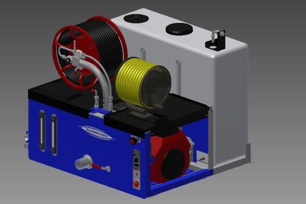 Our 115 van pack jetter cleans drains up to 200mm diameter. It is the smallest jetter in our van pack range and it has a Honda petrol engine which can deliver 3000 psi (200 bar) up to 8 gpm (36 l/min).
